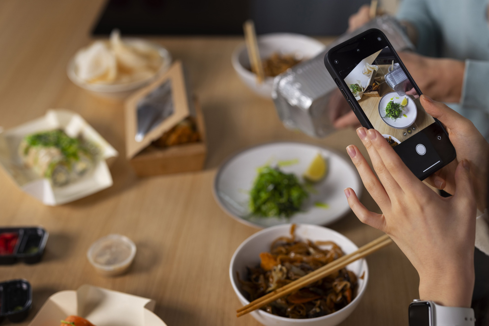 Teknik flat lay atau memotret dari atas sering digunakan untuk konten di Instagram dan marketplace. Posisi ini memperlihatkan keseluruhan elemen dengan sangat jelas, cocok untuk makanan yang disajikan di mangkuk dan piring datar.