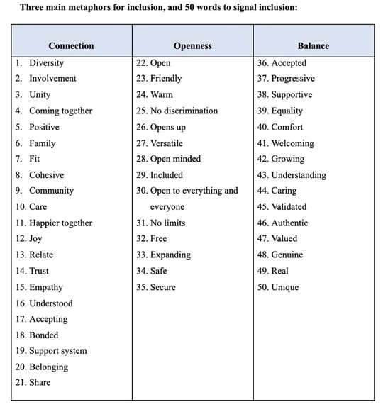 Dikutip dari Microsoft Advertising, terdapat 50 petunjuk berbasis bahasa yang menandai inklusi, serta 3 metafora inklusi (Connection, Openness, dan Balance) yang tak terpisahkan dari emosi. Jika digunakan dalam konteks dan dengan cara yang tulus dan otentik dalam salinan iklan, situs web, atau pemasaran konten digital UMKM, metafora ini dapat membantu menyampaikan inklusi dan meningkatkan kinerja merek UMKM.