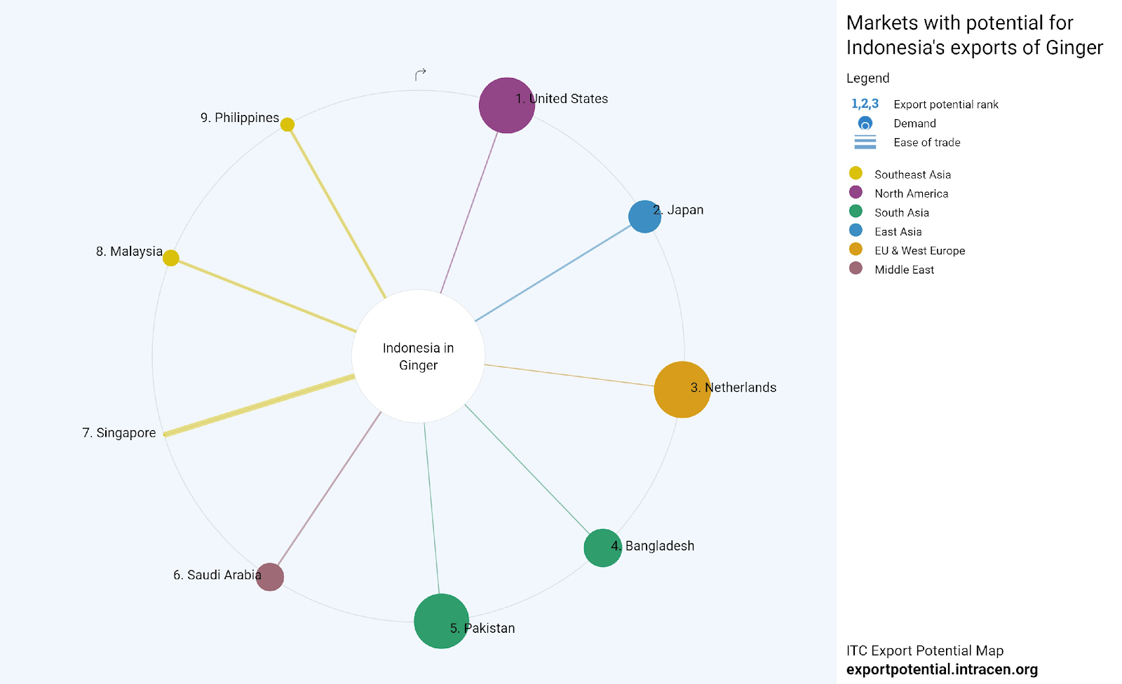 Belanda, sebagai negara yang berperan penting dalam perdagangan internasional, menawarkan peluang yang menarik bagi ekspor jahe dari Indonesia. Menurut data Export Potential Map, potensi ekspor jahe ke Belanda mencapai $574 ribu atau sekitar 8,7 miliar rupiah. Namun, ekspor jahe yang tercatat ke Belanda saat ini hanya mencapai $84 ribu atau sekitar 1,3 miliar rupiah, meninggalkan potensi ekspor yang belum terealisasi sebesar $489 ribu atau sekitar 7,4 miliar rupiah.
