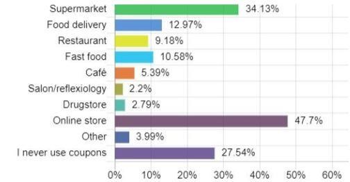 Gunakan saluran kupon yang sering pelanggan cari seperti toko online (47.7%), supermarket (34.13%) dan pesan antar (12.97%), bisnis dapat menyesuaikan strategi pemasaran tertarget untuk mencapai lebih banyak pelanggan potensial.
