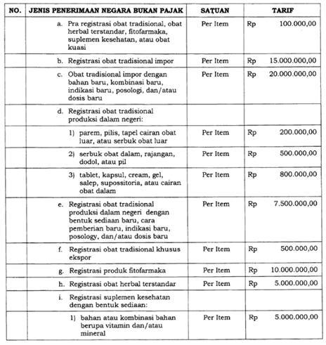 Peraturan ini mengatur tentang jenis penerimaan dan tarif PNBP, termasuk untuk registrasi produk obat tradisional, suplemen kesehatan, dan obat kuasi. Informasi lengkap mengenai tarif pendaftaran dapat dilihat pada lampiran peraturan di bawah ini, memastikan transparansi dan kejelasan biaya yang harus dibayar oleh pelaku usaha untuk registrasi produknya.