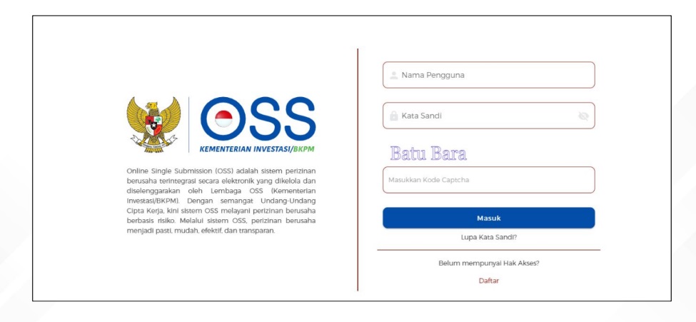 Sahabat Wirausaha kunjungi kembali website OSS lalu masukkan username, password, dan CAPTCHA yang tertera.