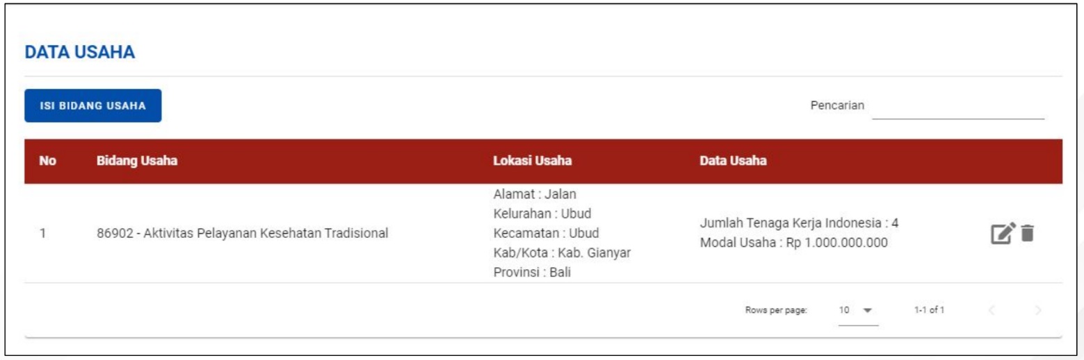 Selanjutnya sistem akan menampilkan tabel data usaha yang sudah Sahabat Wirausaha isi, terdiri dari Bidang Usaha, Lokasi Usaha, dan Data Usaha.