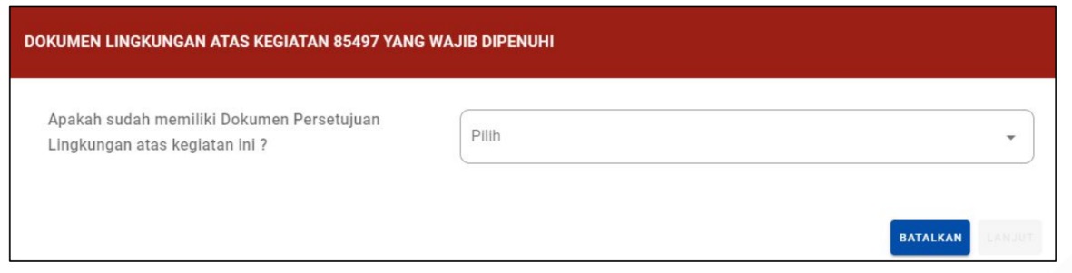 Jika usaha Sahabat Wirausaha masuk ke tingkat risiko menengah rendah, maka sistem akan menampilkan pertanyaan konfirmasi “Apakah sudah memiliki Dokumen Persetujuan Lingkungan atas kegiatan ini?”