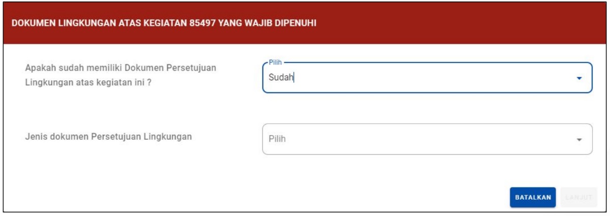 Jika pilih Sudah, pilihlah jenis dokumen persetujuan lingkungan yang dimiliki.