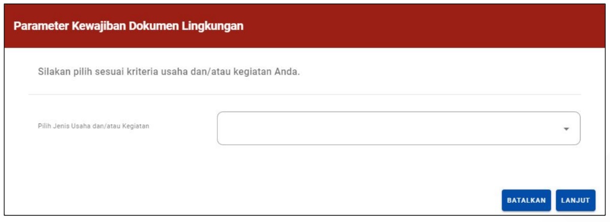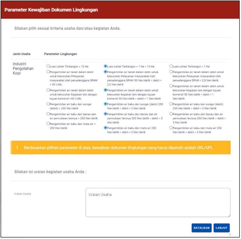 - Parameter Lingkungan, pilihlah kondisi parameter yang tertera pada formulir sesuai dengan kegiatan usaha yang dilakukan. (Kemudian, sistem akan menampilkan jenis kewajiban dokumen lingkungan yang harus dipenuhi, seperti SPPL, UKL/UPL, atau AMDAL).