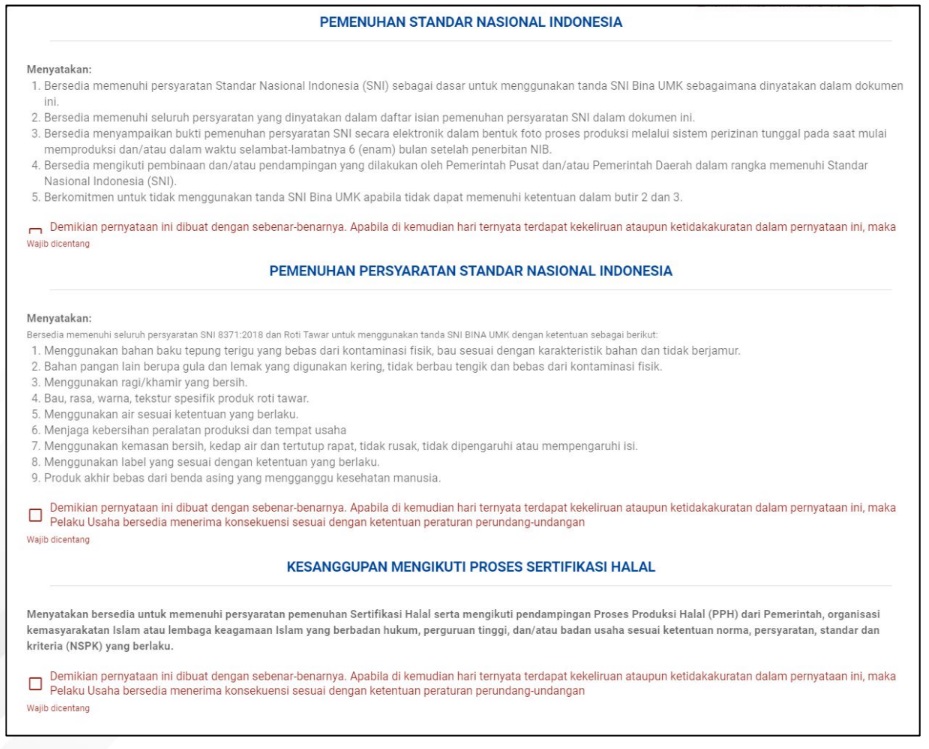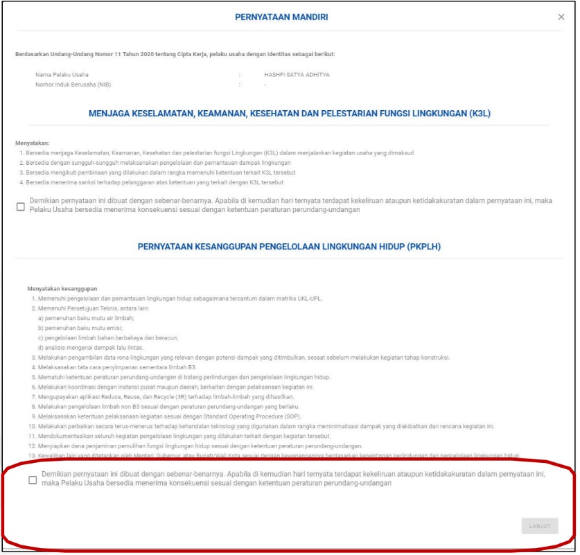 Khusus untuk perizinan tunggal dan pada KBLI tertentu yang membutuhkan Standar Nasional Indonesia (SNI) dan Sertifikasi Halal, maka surat Pernyataan Mandiri akan terlihat seperti berikut. Centang semua pernyataan, lalu klik Lanjut.