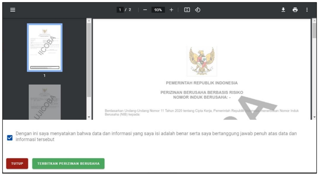 Centang kolom pernyataan dan pilih Terbitkan Perizinan Berusaha.