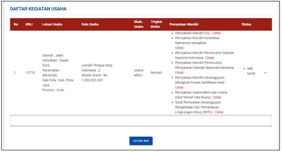Akhirnya perizinan berusaha sudah terbit! Sahabat Wirausaha bisa mencetaknya dengan menekan tombol Cetak NIB.