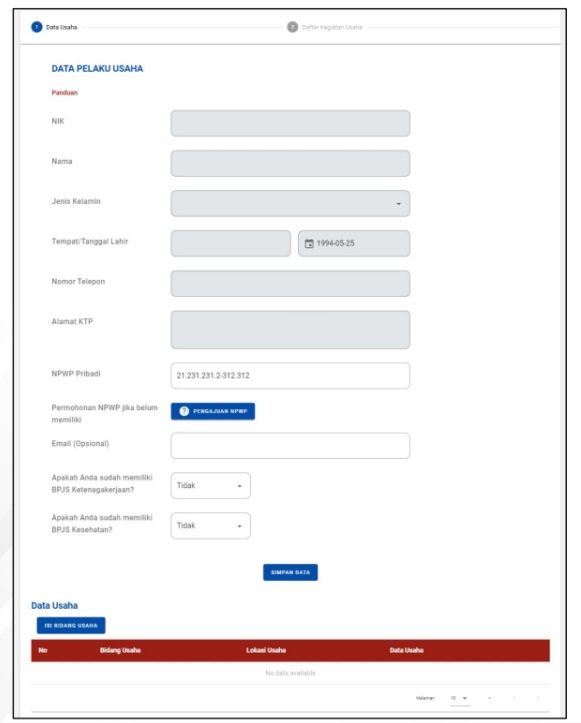 Selanjutnya isi formulir data usaha yang terdiri dari :