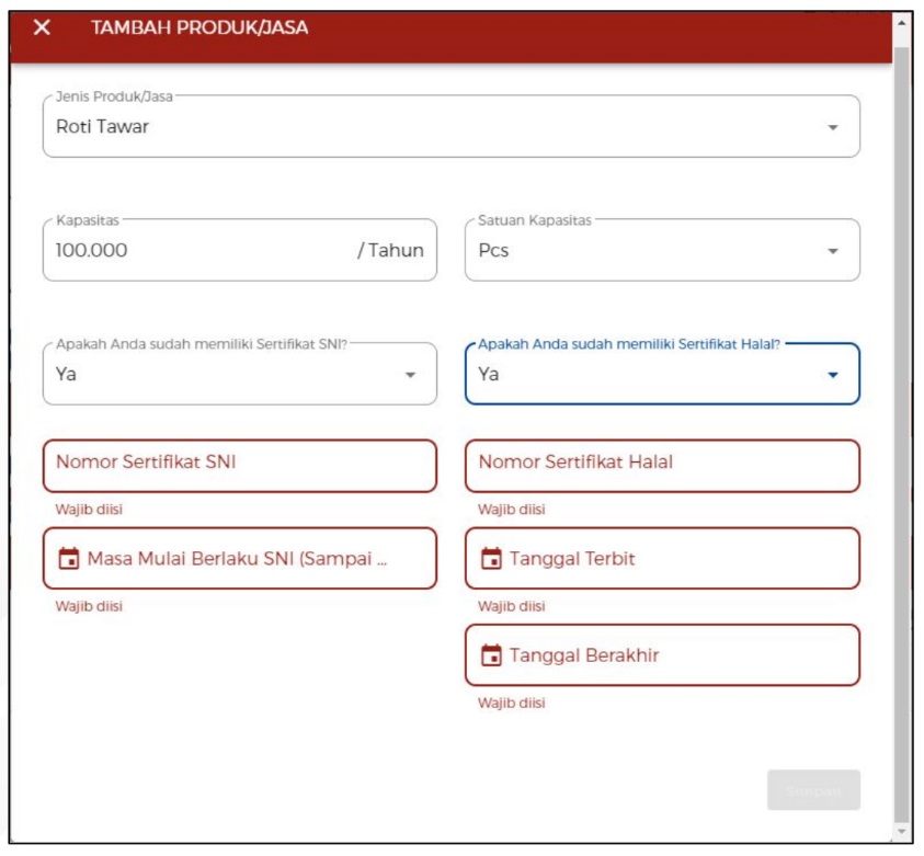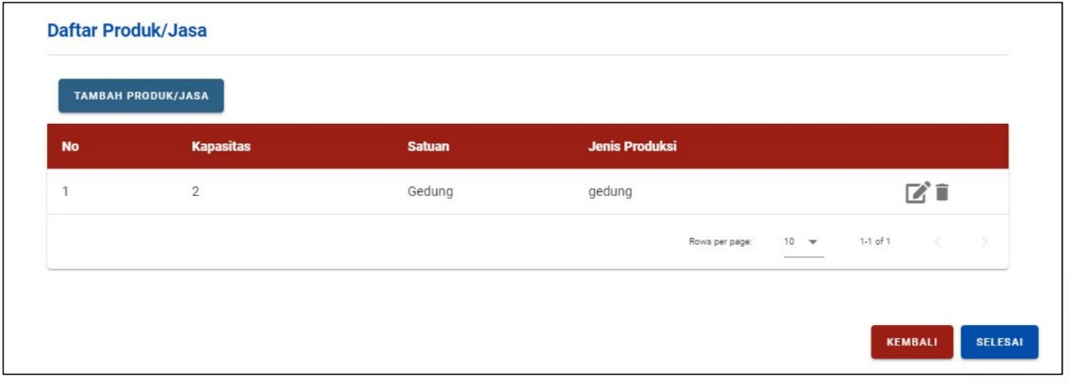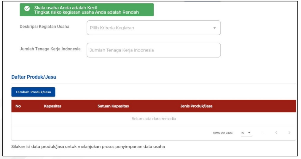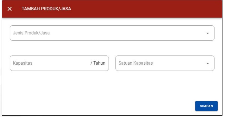 Di bagian bawah terdapat menu Daftar Produk/Jasa, klik menu Tambah Produk/Jasa lalu isi data jenis produk/jasa, kapasitas per tahun, dan satuan kapasitas. Jika sudah terisi, klik Simpan.