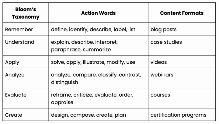 Dari tabel diatas, kita dapat membuat peta konten yang menguraikan semua topik yang akan dibahas dan format apa yang akan diambil setiap bagian konten (misalnya, blog post, video, infografis). Gunakan ‘format konten’ yang paling sesuai dengan mengaitkan hasil ‘kognitif’ yang diharapkan.