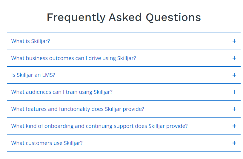 Ini adalah kumpulan pertanyaan yang sering diajukan oleh pengguna atau pelanggan beserta jawaban yang relevan. Misalnya Skilljar yang menyematkan deskripsi tersebut di halaman web paling bawah seperti berikut ini: