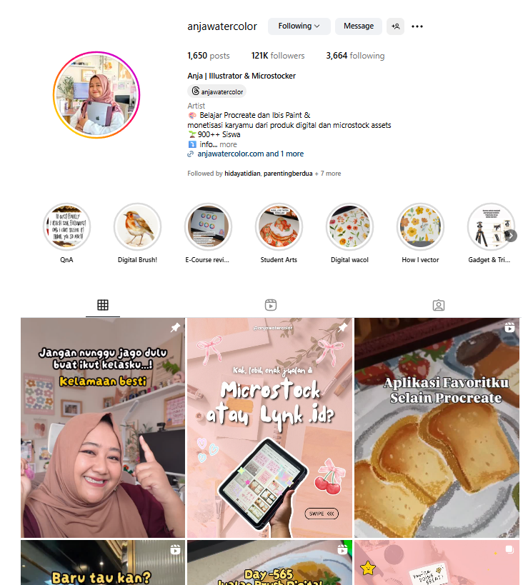 Akun Instagram Anjawatercolor perlahan berubah menjadi galeri digital yang ramai dikunjungi pencinta seni watercolor. Produk-produknya kini tersedia di berbagai platform seperti Adobe Stock, Lynk.id, Microstock, dan Freepik.