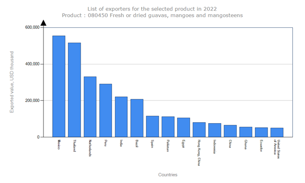 Indonesia menunjukkan kehadiran yang kuat di pasar ekspor mangga, mengungguli beberapa negara lain seperti Tiongkok dan Amerika Serikat. Meskipun demikian, ada ruang yang cukup untuk pertumbuhan, terlihat dari perbandingan nilai ekspor dengan negara-negara yang berada di urutan teratas.