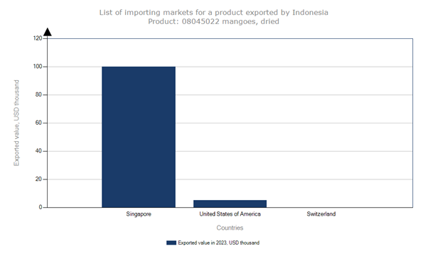Saat terjadi gemerlap pada mangga segar Indonesia di pasar global, mangga kering Indonesia mengalami hal sebaliknya. Pada tahun 2023, negeri ini terlihat bagai kapal yang terombang-ambing di lautan perdagangan global, dengan hanya sedikit buah kering yang berhasil menjangkau pelabuhan internasional. Grafik di atas memperlihatkan hanya Singapura, Amerika Serikat, dan Swiss yang menjadi rumah bagi produk mangga kering yang dihasilkan dari kebun-kebun tropis Indonesia.