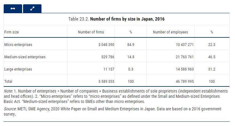Menurut data dari oecd-ilibrary.org, di tahun 2016 tercatat bahwa jumlah perusahaan di sektor Usaha Mikro (Micro Enterprises) sebanyak 3.048.390 atau sebanyak 84,9% dari total perusahaan yang ada di Jepang dengan menyerap tenaga kerja sebanyak 10.437.271 karyawan. Sementara itu, jumlah perusahaan di sektor Usaha Kecil dan Menengah (Medium-Sized Enterprises) sebanyak 529.786 atau sebanyak 14,8%. Namun demikian, jumlah tenaga kerja lebih banyak diserap oleh UKM dibanding Usaha Mikro yaitu sebanyak 21.763.761 atau sebanyak 46,5%.