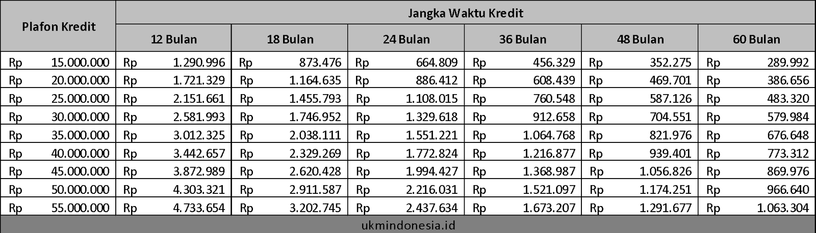 Berikut ini adalah gambaran/skema pembayaran angsuran untuk KUR Mikro dengan plafon pinjaman mulai dari 15 juta rupiah hingga 55 juta rupiah. Jangka waktu pinjaman mulai dari 12 bulan hingga 60 bulan.