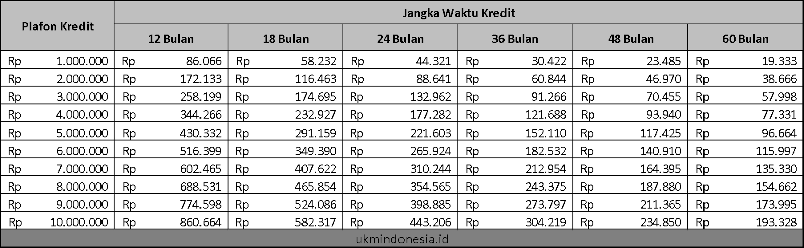 Berikut ini adalah gambaran/skema pembayaran angsuran untuk KUR Super Mikro dengan plafon pinjaman mulai dari 1 juta rupiah hingga 10 juta rupiah. Jangka waktu pinjaman mulai dari 12 bulan hingga 60 bulan.
