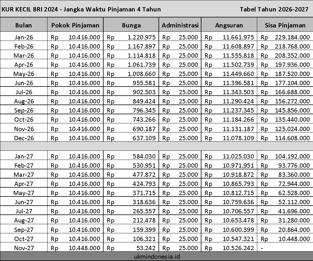 Gambar tabel angsuran KUR Kecil berikut ini akan dibagi menjadi dua periode yaitu periode tahun 2024-2025 dan tahun 2026-2027 sebagai berikut.