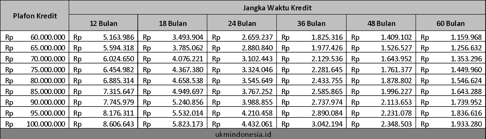 Berikut ini adalah gambaran/skema pembayaran angsuran untuk KUR Mikro dengan plafon pinjaman mulai dari 60 juta rupiah hingga 100 juta rupiah. Jangka waktu pinjaman mulai dari 12 bulan hingga 60 bulan.