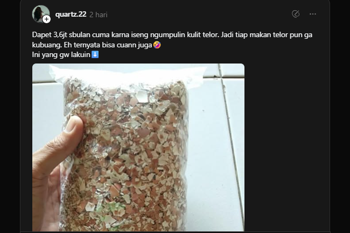 Kisah ini pertama kali viral di media sosial Threads melalui unggahan akun @quartz.22 pada Senin (7/7). Dalam unggahan itu, pemilik akun menulis, “Dapet 3,6jt sbulan cuma karna iseng ngumpulin kulit telor… eh ternyata bisa cuan juga.”