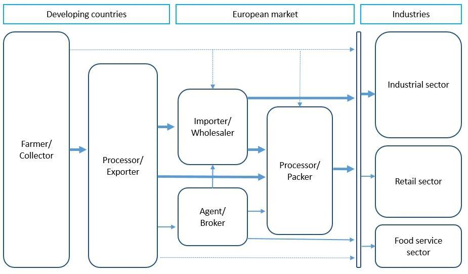 Akan sangat sulit bagi teman-teman untuk bisa mengekspor langsung ke industri pembeli jahe kering di eropa. Hal yang lebih mudah dilakukan adalah melalui perusahaan importir. Gambar di bawah ini menggambarkan jalur masuk jahe kering ke Eropa. Kita bisa mengincar importir rempah-rempah khusus, pengolah rempah-rempah, dan agen/broker.