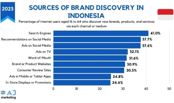 Hal ini diperkuat oleh preferensi konsumen. Apakah kita sudah mengetahui dari mana konsumen Indonesia biasanya mencari brand? Menurut DataReportal 2023, berikut adalah beberapa sumber di mana orang Indonesia umumnya menemukan brand:
