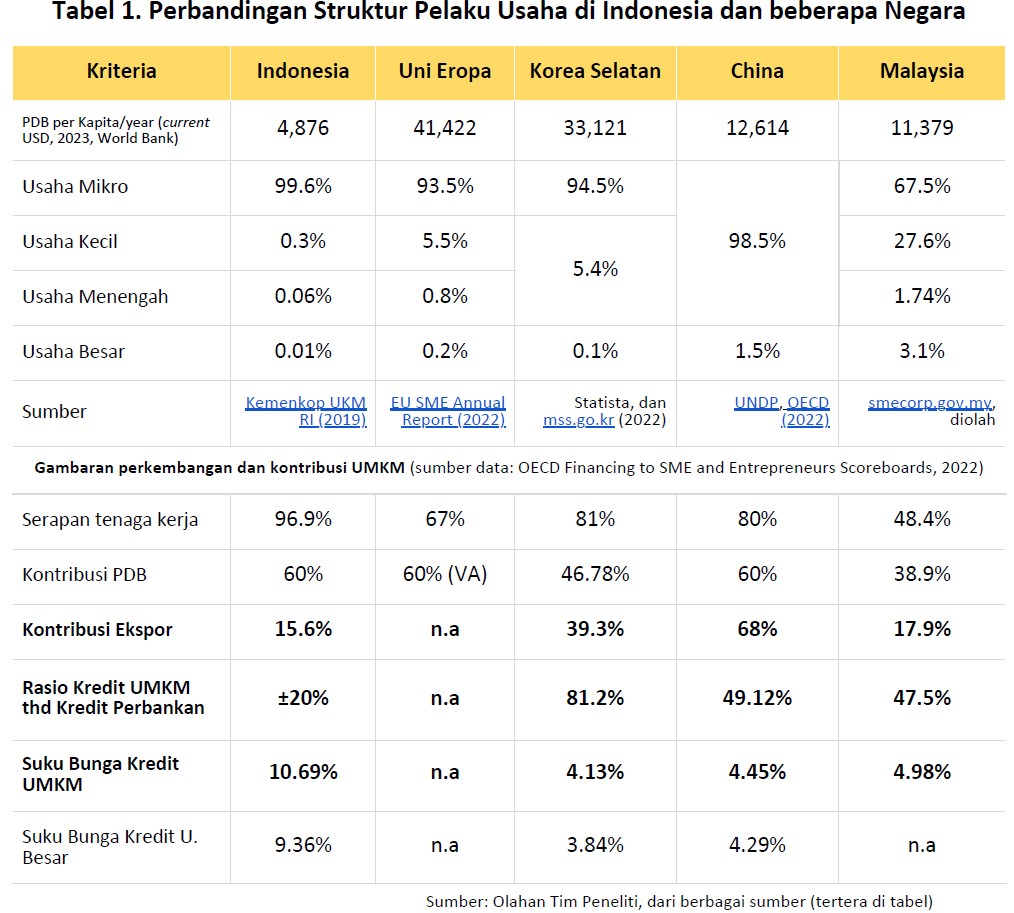 Jika dibandingkan dengan beberapa negara lain, struktur ini tergolong sub-produktif, karena negara lain dengan tingkat pendapatan per kapita yang lebih tinggi, ditopang oleh Usaha Kecil Menengah dan Usaha Besar dengan proporsi yang lebih besar, seperti hasil rangkuman Tim Peneliti UKMIndonesia.id yang tersaji pada tabel berikut.