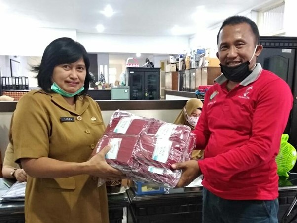 Ken Kerta menyerahkan masker filter produksi Omah Difabel foto: LINKSOS