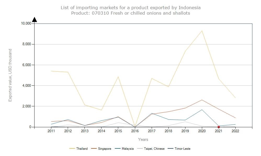 Dalam kurun waktu lima tahun terakhir, Thailand tetap ada di posisi teratas pengiriman bawang merah dengan nilai total ekspor tertinggi menyentuh US$13,8 juta (sekitar Rp207 triliun) di tahun 2020. Jumlah itu kemudian mengalami penurunan di tahun 2021 menjadi senilai US$7,028 juta (sekitar Rp105,4 triliun) dan US$3,985 juta (sekitar Rp59,7 triliun) pada tahun 2022.