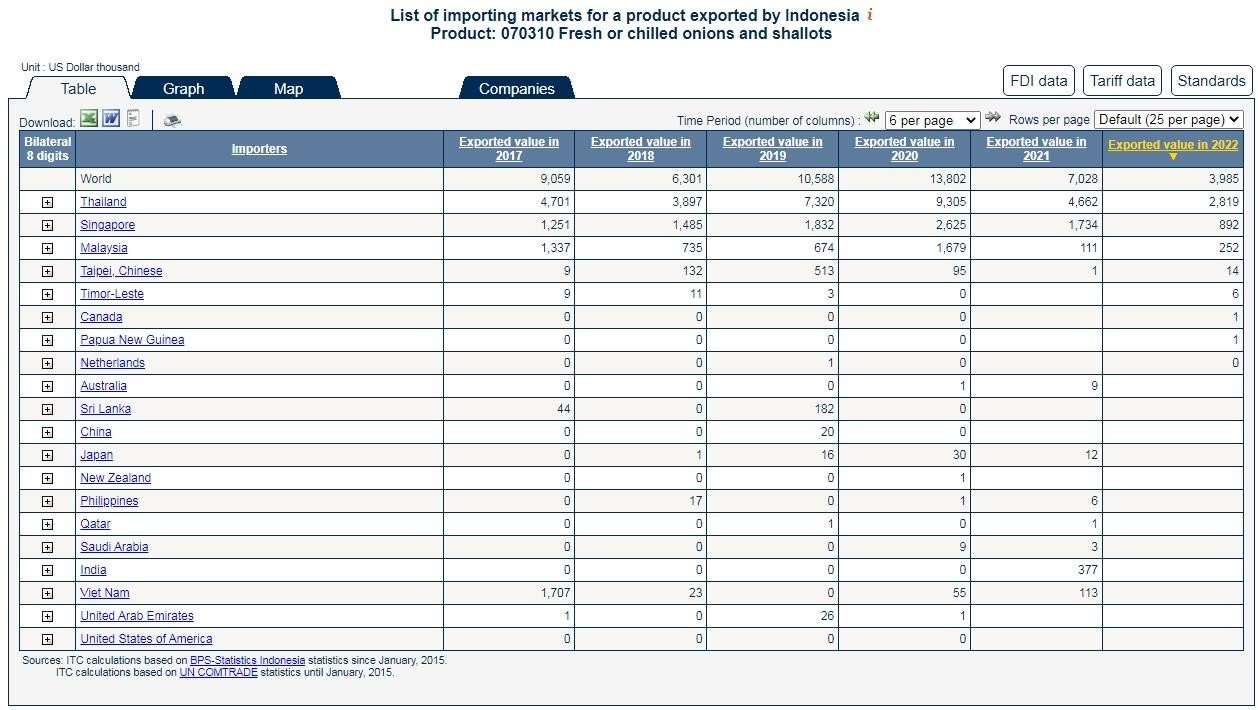 Foto: laporan Trademap soal negara tujuan ekspor bawang merah asal Indonesia