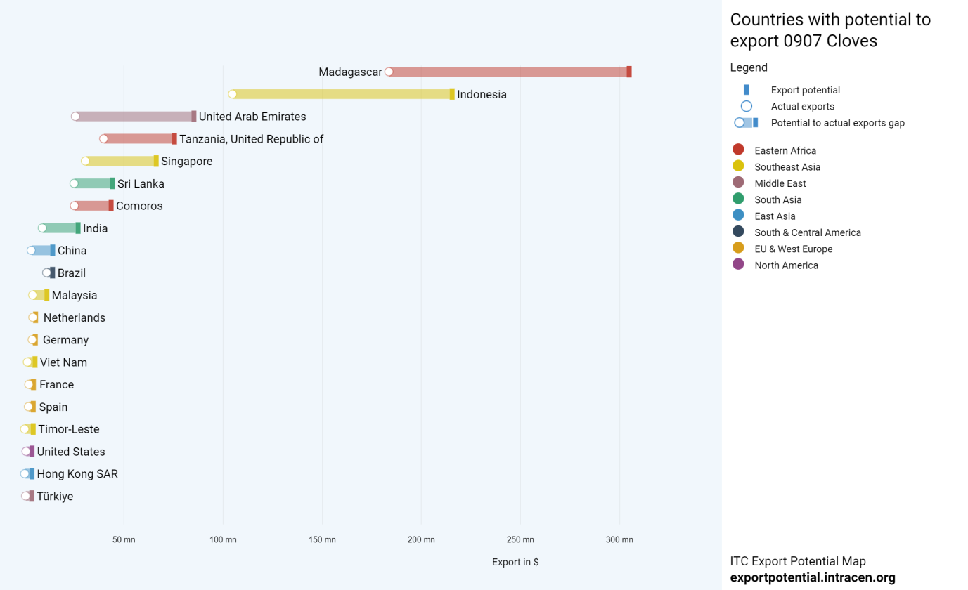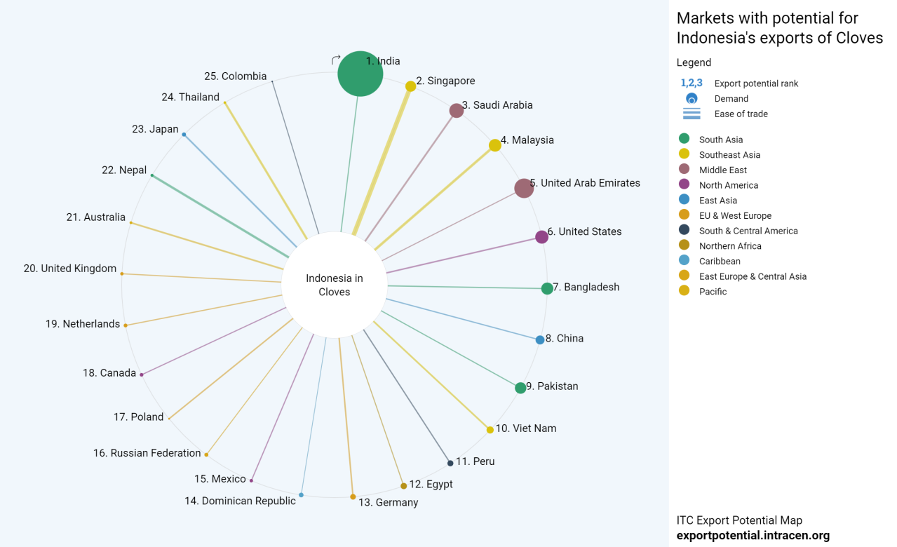 Lantas, negara manakah yang paling potensial untuk ekspor cengkeh dari Indonesia? Untuk menjawab hal ini, kita perlu melihat data dari exportpotential.intracen.org yang tampak pada gambar berikut ini.