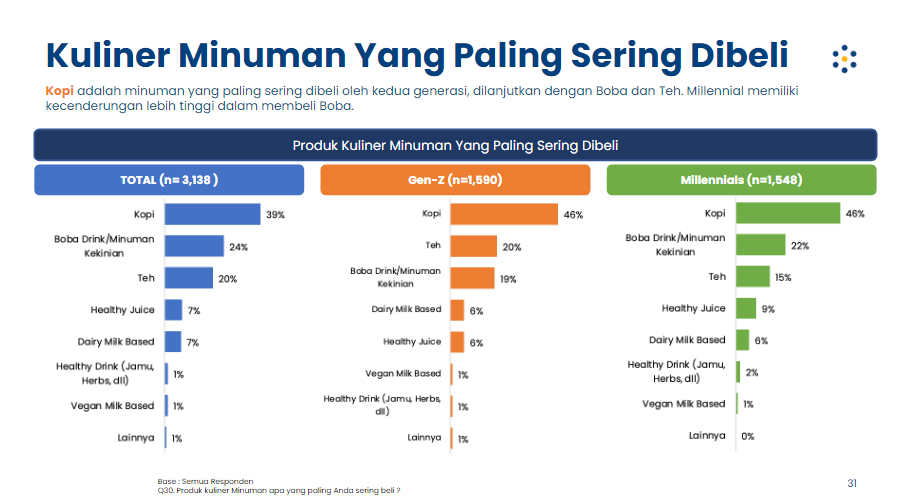 Berdasarkan jenisnya, kuliner minuman yang sering dibeli adalah kopi 46%, Teh 20%, dan Minuman Boba/Minuman Kekinian. Menurut Deka Insight dalam laporan riset Indonesia F&B Market Research 2021 ‘Indonesian Eating Out Behavior in New Normal’.