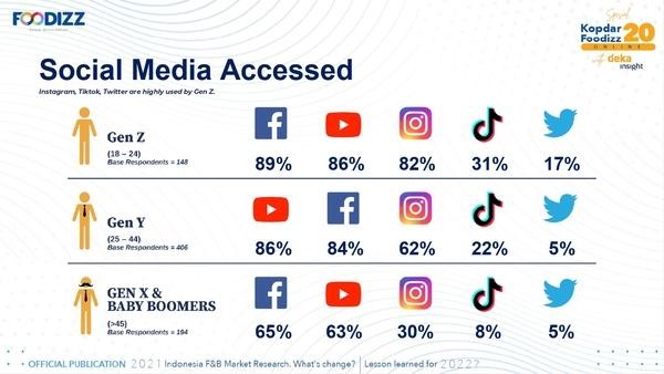 Sahabat Wirausaha yang model bisnisnya di kuliner lebih efektif melakukan promo khusus target market gen Z paling tinggi mengakses social media Facebook (89%), diikuti YouTube (86%), Instagram (82%), Tiktok (31%), dan Twitter (17%).