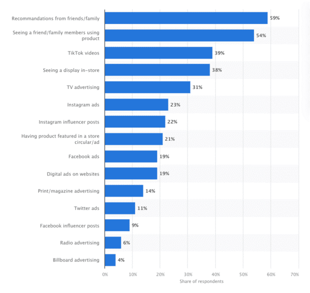 Seperti rekomendasi dari teman/keluarga dan melihat teman/keluarga menggunakan produk. Iklan Instagram dan posting influencer IG juga menduduki peringkat tinggi, sementara iklan Facebook dan Twitter kurang mungkin meyakinkan Gen Z.