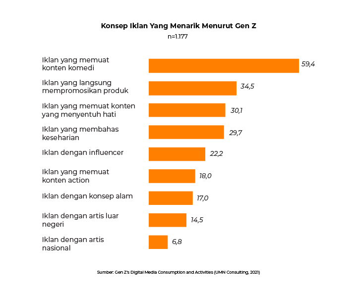 Berdasarkan riset UMN Consulting dalam topik ‘Gen Z’s Digital Media Consumption and Activities 2021’, Gen Z lebih menyukai iklan yang memuat konten komedi (59.4%) dibandingkan iklan yang langsung mempromosikan produk (34.5%), dan iklan yang memuat konten yang menyentuh hati (30.1%).
