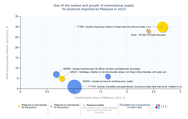 Barang mewah kayak perhiasan (kode HS 711319) tuh jadi raja belanjaan kategori kerajinan di Malaysia yang ditunjukkan dari lingkaran paling besar. Bayangin, nilai impornya mencapai 927 juta USD. Padahal, pertumbuhan ekspor globalnya lagi ga ada. Logam-logam berharga (kode HS 711319) juga ikut nimbrung di daftar impor teratas. Ini digambarkan dengan nilai impor mencapai 533 juta USD. Malaysia lagi fokus pada yang berkilau nih kayaknya.