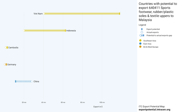 Grafik di atas menunjukkan trek lari untuk potensi ekspor sepatu olahraga ke Malaysia. Kita lihat yang menyaingi Indonesia hanyalah Vietnam, berlenggak-lenggok di garis depan potensi ekspor sepatu olahraga ke Malaysia. Bayangin, potensi ekspor sepatu olahraga mereka ke Malaysia itu di angka 117 juta USD. Tapi, yang udah mereka kirim ke pasaran baru sekitar 40 juta USD. Jadi, masih ada gap senilai 77 juta USD lagi, yang siap untuk disikat oleh Vietnam di pasar Malaysia.