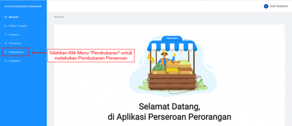 - Setelah berhasil masuk ke halaman utama Aplikasi Perseroan Perseorangan, pilihlah menu “Pembubaran” untuk melakukan pembubaran PT Perorangan.