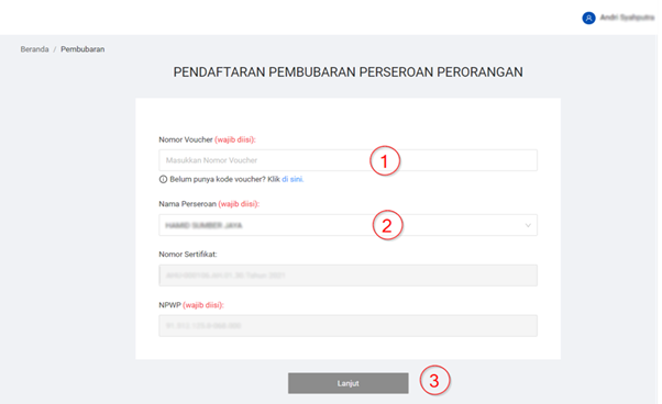 - Kemudian, Sahabat Wirausaha akan diarahkan menuju halaman Pendaftaran Pembubaran PT Perorangan dan kemudian mengisi formulir yang tertera. Formulir ini sifatnya adalah wajib untuk melakukan pembubaran PT Perorangan. Setelah kolom nomor voucher, nama perseroan, dan NPWP telah diisi, klik “Lanjut”.