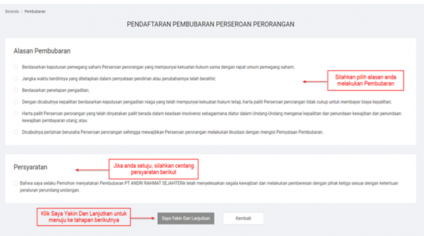 - Pilihlah alasan pembubaran PT Perorangan yang sesuai dengan kondisi Sahabat Wirausaha, kemudian centang kotak “Persyaratan”, dan klik “Saya Yakin Dan Lanjutkan” untuk menuju ke tahap selanjutnya.