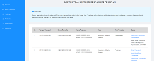 - Jika permohonan pembubaran PT Perorangan telah selesai diajukan, Sahabat Wirausaha akan diarahkan ke halaman Daftar Transaksi untuk melakukan konfirmasi pembubaran perseroan, dengan contoh seperti gambar berikut. Klik “Konfirmasi Pernyataan Pembubaran” untuk mengonfirmasi pengajuan pembubaran Sahabat Wirausaha. Batas waktu yang diberikan untuk melakukan konfirmasi adalah maksimal 7 (tujuh) hari dari tanggal permohonan pembubaran PT Perorangan. Jika dalam rentang waktu tersebut tidak ada konfirmasi dari Sahabat Wirausaha, maka permohonan dianggap batal dan harus membuat permohonan baru dengan cara yang sama seperti sebelumnya.