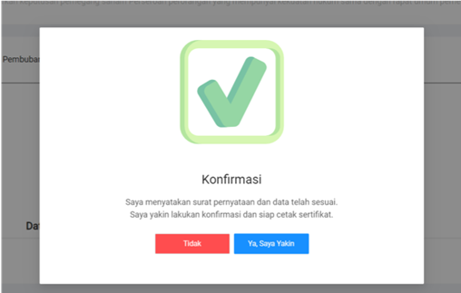 - Apabila Sahabat Wirausaha klik “Konfirmasi”, maka akan muncul tampilan sebagai berikut. Klik “Ya, Saya Yakin” untuk finalisasi pembubaran PT Perorangan. Atau, Klik “Tidak” jika Sahabat Wirausaha belum yakin dengan data yang akan difinalisasi dan ingin kembali mengecek data Permohonan Pembubaran Perseroan.