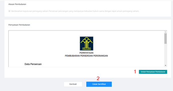 - Setelah melakukan konfirmasi, Sahabat Wirausaha dapat mencetak sertifikat Pernyataan Pembubaran Perseroan.