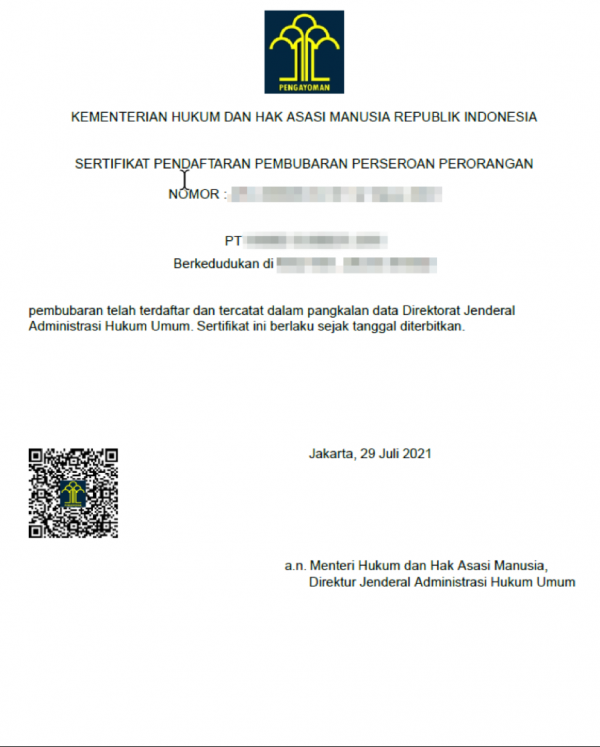 Berikut adalah contoh sertifikat pembubaran PT Perorangan: