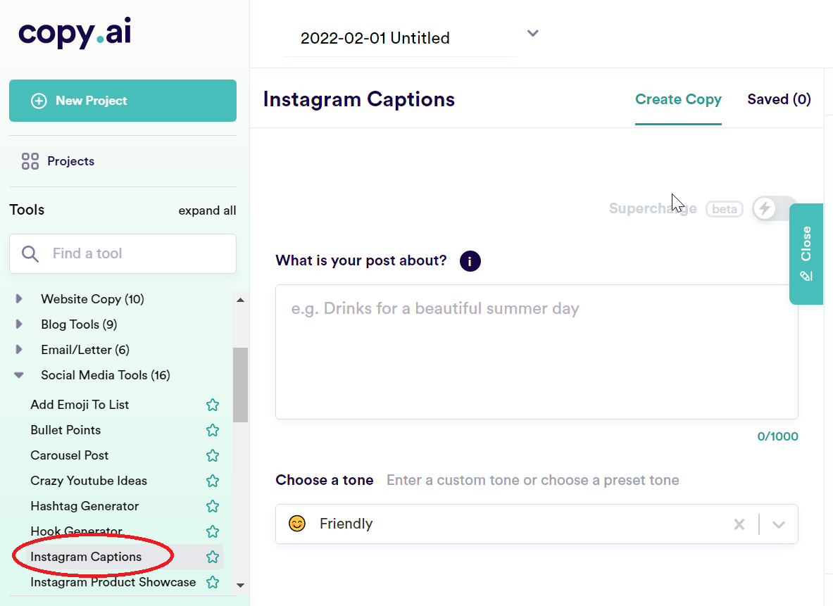 Copy.ai adalah sebuah alat berbasis kecerdasan buatan (AI) yang memungkinkan pembuatan konten secara otomatis, termasuk judul blog, email, konten media sosial Instagram, dan teks web. Manfaat utamanya adalah menghemat waktu, karena alat ini dapat dengan mudah mengambil alih pekerjaan berat menulis konten.