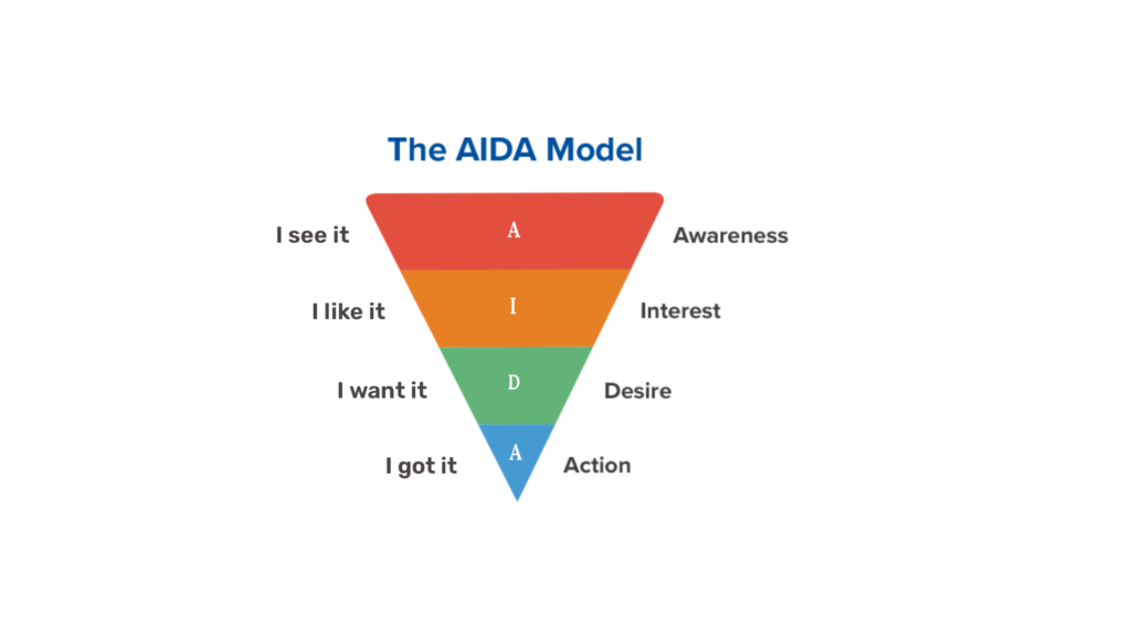 Terdapat 4 tahap marketing funnel paling umum, diantaranya adalah model AIDA yang membantu pemasar memahami apa yang terjadi dalam pikiran calon pelanggan, dimulai dari kesadaran awal terhadap produk hingga pembelian akhir. Model AIDA ini terdiri dari tahapan Awareness, Interest, Desire, dan Action.