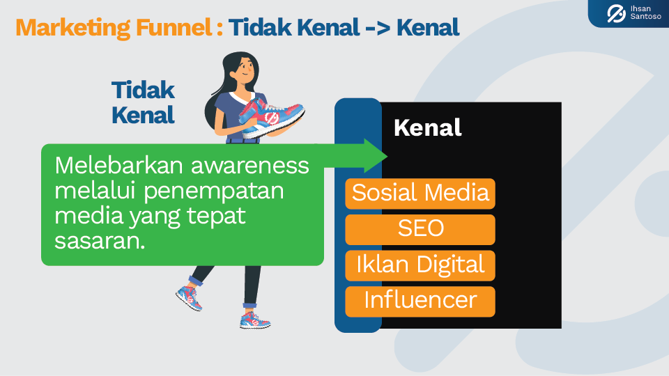 Pada tahap ini, target pasar berada pada posisi transisi, dari “tidak kenal” dengan kita, menjadi lebih tau “kenal” tentang merek kita. Karenanya, kita ingin menampilkan iklan-iklan di tempat yang sering dikunjungi oleh konsumen, seperti: