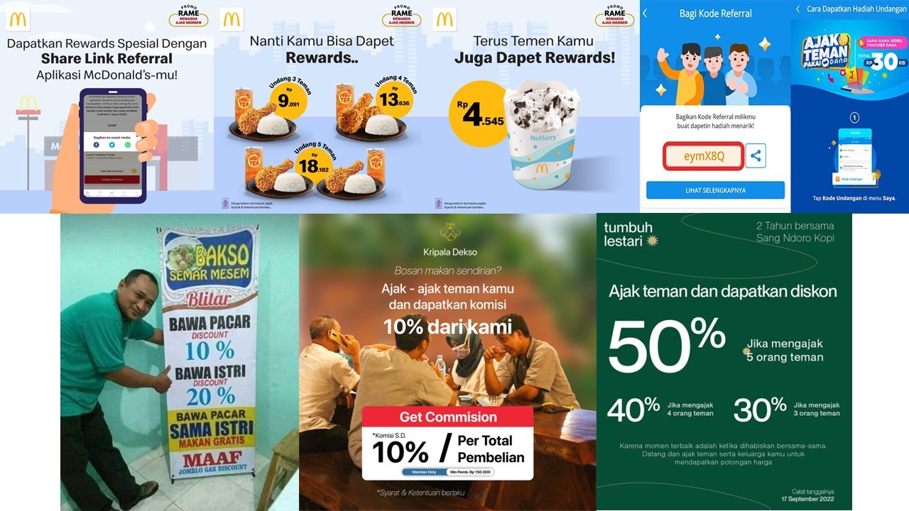 Atau kita memasukan informasi kode referral ke kemasan produk kita, dan memberikan komisi untuk setiap referensi yang berhasil membeli produk kita yang bisa ditukar ke e-commerce seperti Tokopedia, Gofood, dan toko offline. Program ini dapat mendorong pelanggan setia kita untuk memperluas jaringan dan membantu kita mendapatkan klien baru.
